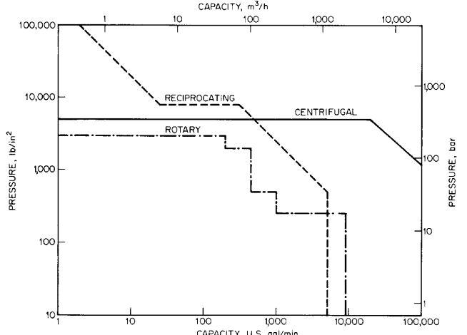 کاربرد پمپ­ها از نظر دبي و ارتفاع نيز يکي ديگر از عوامل محدودکننده­ي مصرف اين نوع ماشين­هاست. در شکل­هاي زير محدوده­ي کاربرد و مقايسه­ي انواع پمپ­ها نسبت به تغييرات دبي و ارتفاع توليدي نشان داده شده است. همان طوري که در هر دو شکل ملاحظه مي­گردد، توربوپمپ­ها (پمپ­های توربوماشین یا به عبارتی آن دسته از پمپ­ها که در تعریف توربوماشین­ها جای می­گیرند) شامل سه نوع محوري، سانتريفيوژ و مختلط، عملاً منطقه­ي بسيار وسيعي از صفحه را پوشش مي­دهند و به همين علت نيز کاربرد آن­ها از ديگر پمپ­ها به مراتب بيش­تر مي­باشد. شکل زیر محدوده کاربرد پمپ­های مختلف را در مقایسه با یکدیگر نشان می­دهد: